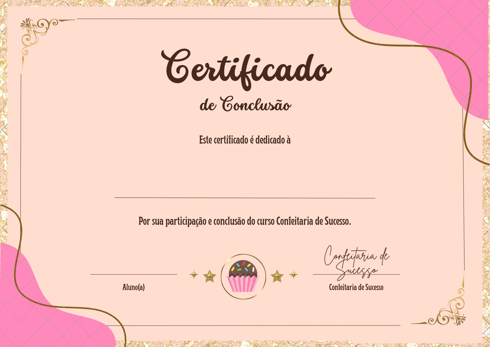 Você receberá o seu certificado assinado com a merecida aprovação de competência, pronto para ser impresso e exposto em sua confeitaria.